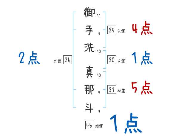 外運![]() | 御手洗真那斗さんの外運は26画の2つ星!波瀾万丈かも。信頼できる人を大事にしましょう。 生活面を象徴する運勢です。外部から受ける影響力を表し、結婚運、家庭運や職場、環境への順応性を表します。 |