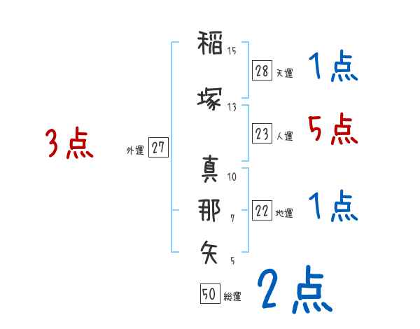 天運![]() | 稲塚真那矢さんの天運は28画の1つ星!家庭環境に注意。スポーツで活躍できる能力があるかも。 家系が持つ宿命的な運勢を表します。祖先から受け継いだ苗字ですので自分の力が及びません。家柄を象徴します。 |