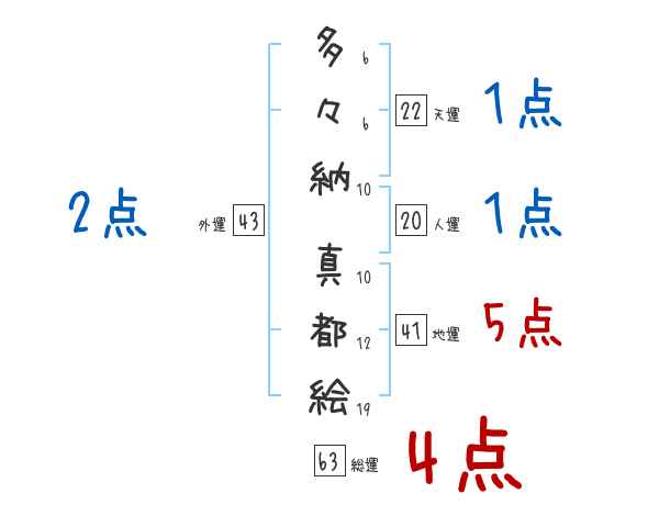 天運![]() | 多々納真都絵さんの天運は22画の1つ星!努力することが苦手ないっぽう手先が器用。芸術性にも優れる。 家系が持つ宿命的な運勢を表します。祖先から受け継いだ苗字ですので自分の力が及びません。家柄を象徴します。 |