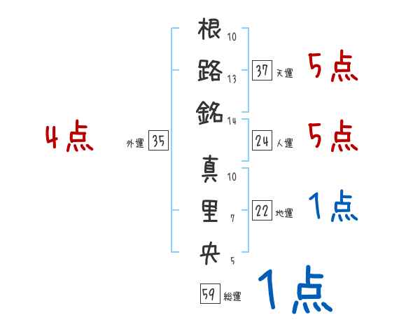 総運![]() | 根路銘真里央さんの総運は59画の1つ星!意志の弱さであきらめることが多いかも。粘り強さが必要。 あなたの人生を表す1番重要な運勢です。生涯を通じて影響する総合運となり、主に50歳以降の晩年期に影響を及ぼします。 |