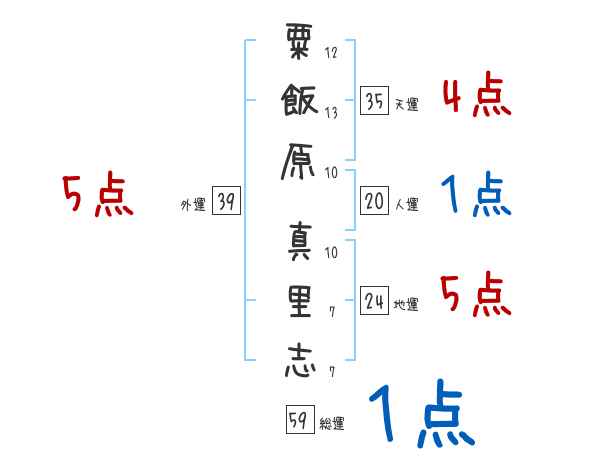 外運![]() | 粟飯原真里志さんの外運は39画の5つ星!社交性に優れ人望が厚い。人の上に立ち成功する。 生活面を象徴する運勢です。外部から受ける影響力を表し、結婚運、家庭運や職場、環境への順応性を表します。 |