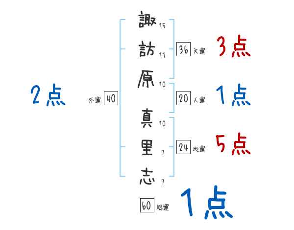 天運![]() | 諏訪原真里志さんの天運は36画の3つ星!先見性が豊かです。多少神経質で苦労することも。 家系が持つ宿命的な運勢を表します。祖先から受け継いだ苗字ですので自分の力が及びません。家柄を象徴します。 |
