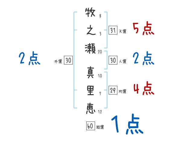総運![]() | 牧之瀬真里恵さんの総運は60画の1つ星!悲観的で迷いやすい。波乱が多く損をしないように。 あなたの人生を表す1番重要な運勢です。生涯を通じて影響する総合運となり、主に50歳以降の晩年期に影響を及ぼします。 |