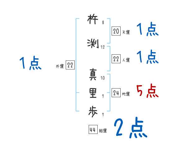 外運![]() | 杵渕真里歩さんの外運は22画の1つ星!努力することが苦手ないっぽう手先が器用。芸術性にも優れる。 生活面を象徴する運勢です。外部から受ける影響力を表し、結婚運、家庭運や職場、環境への順応性を表します。 |