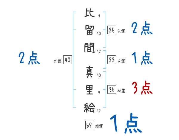 天運![]() | 比留間真里絵さんの天運は26画の2つ星!波瀾万丈かも。信頼できる人を大事にしましょう。 家系が持つ宿命的な運勢を表します。祖先から受け継いだ苗字ですので自分の力が及びません。家柄を象徴します。 |