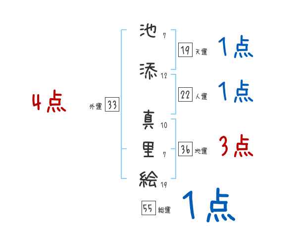 外運![]() | 池添真里絵さんの外運は33画の4つ星!権力志向でプライドが高い。勇気があり運を切り開き成功する。 生活面を象徴する運勢です。外部から受ける影響力を表し、結婚運、家庭運や職場、環境への順応性を表します。 |