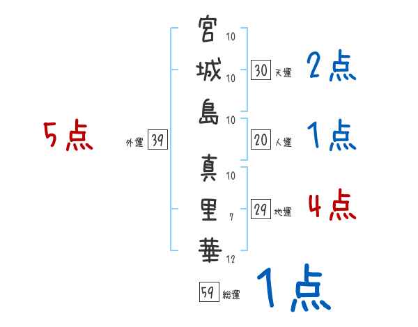 外運![]() | 宮城島真里華さんの外運は39画の5つ星!社交性に優れ人望が厚い。人の上に立ち成功する。 生活面を象徴する運勢です。外部から受ける影響力を表し、結婚運、家庭運や職場、環境への順応性を表します。 |