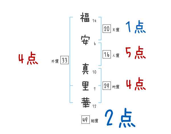 人運![]() | 福安真里華さんの人運は16画の5つ星!人望が厚く大きく発展する。逆転成功が見える。 性格や才能などを表す2番目に重要な運勢です。人間関係や協調性、社会的な成功に影響します。主に20歳から50歳ぐらいまでの中年期の運勢を表します。 |