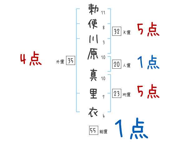 天運![]() | 勅使川原真里衣さんの天運は32画の5つ星!柔軟性があり成功する。チャンスが多く金運が良い。 家系が持つ宿命的な運勢を表します。祖先から受け継いだ苗字ですので自分の力が及びません。家柄を象徴します。 |