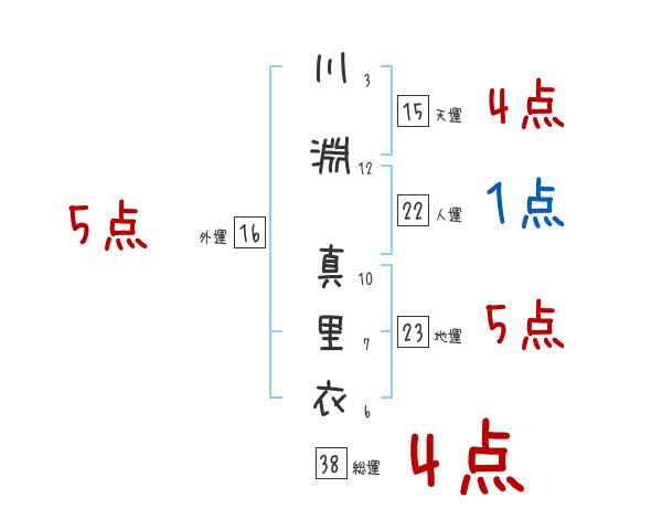 外運![]() | 川淵真里衣さんの外運は16画の5つ星!人望が厚く大きく発展する。逆転成功が見える。 生活面を象徴する運勢です。外部から受ける影響力を表し、結婚運、家庭運や職場、環境への順応性を表します。 |