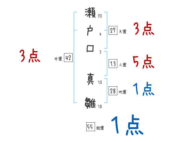 外運![]() | 瀬戸口真雛さんの外運は42画の3つ星!病気に注意。多芸であるが消極的でおとなしい。 生活面を象徴する運勢です。外部から受ける影響力を表し、結婚運、家庭運や職場、環境への順応性を表します。 |