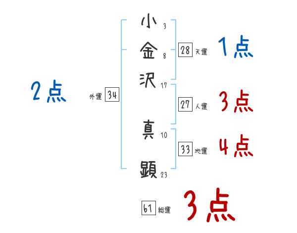 地運![]() | 小金沢真顕さんの地運は33画の4つ星!権力志向でプライドが高い。勇気があり運を切り開き成功する。 個性を表す基礎的な運勢です。性格形成や対人関係、行動力など家庭環境に影響されます。主に誕生してから20歳くらいまでの若年期の運勢を表します。 |