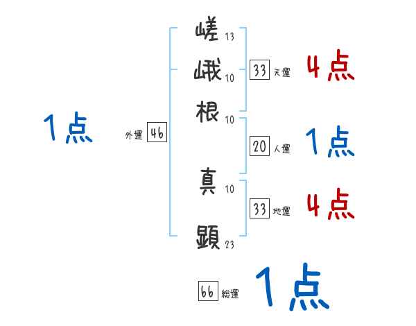地運![]() | 嵯峨根真顕さんの地運は33画の4つ星!権力志向でプライドが高い。勇気があり運を切り開き成功する。 個性を表す基礎的な運勢です。性格形成や対人関係、行動力など家庭環境に影響されます。主に誕生してから20歳くらいまでの若年期の運勢を表します。 |