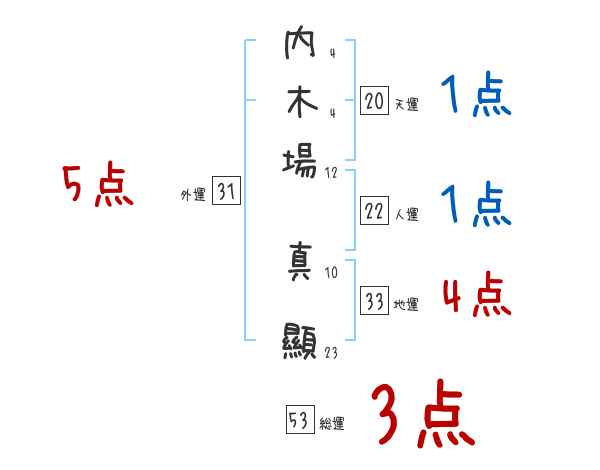 総運![]() | 内木場真顯さんの総運は53画の3つ星!やや見栄っ張りで虚栄心がある。散財に注意。 あなたの人生を表す1番重要な運勢です。生涯を通じて影響する総合運となり、主に50歳以降の晩年期に影響を及ぼします。 |