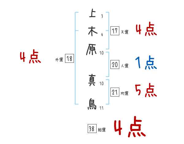外運![]() | 上木原真鳥さんの外運は18画の4つ星!情熱的で剛気。忍耐力があり信頼される。 生活面を象徴する運勢です。外部から受ける影響力を表し、結婚運、家庭運や職場、環境への順応性を表します。 |