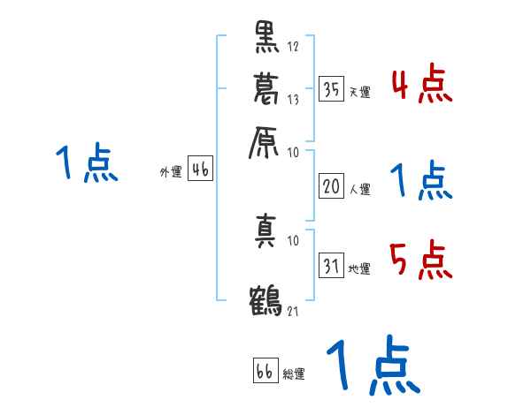 天運![]() | 黒葛原真鶴さんの天運は35画の4つ星!温厚な性格で感受性が高い。穏和な性格で人望が厚い。 家系が持つ宿命的な運勢を表します。祖先から受け継いだ苗字ですので自分の力が及びません。家柄を象徴します。 |