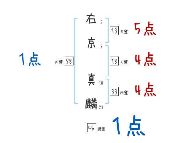 天運![]() | 右京真麟さんの天運は13画の5つ星!才能に恵まれ人気がある。名声を手に入れる。円満な人生。 家系が持つ宿命的な運勢を表します。祖先から受け継いだ苗字ですので自分の力が及びません。家柄を象徴します。 |