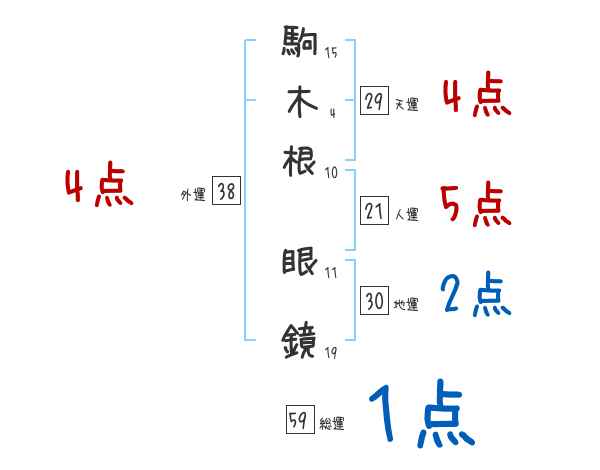天運![]() | 駒木根眼鏡さんの天運は29画の4つ星!完全主義で才能がある。厳格な心の持ち主。 家系が持つ宿命的な運勢を表します。祖先から受け継いだ苗字ですので自分の力が及びません。家柄を象徴します。 |
