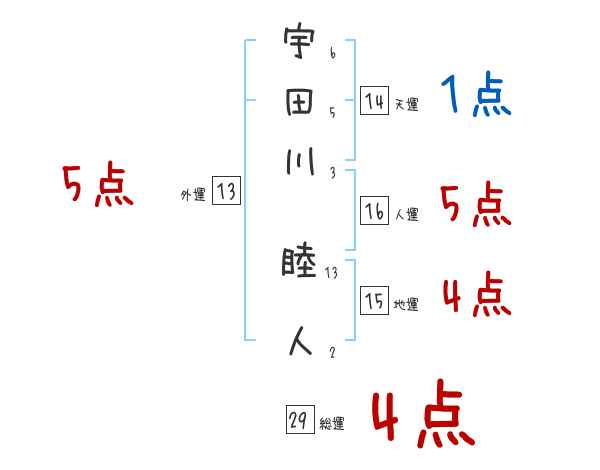 総運![]() | 宇田川睦人さんの総運は29画の4つ星!完全主義で才能がある。厳格な心の持ち主。 あなたの人生を表す1番重要な運勢です。生涯を通じて影響する総合運となり、主に50歳以降の晩年期に影響を及ぼします。 |