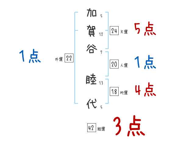 外運![]() | 加賀谷睦代さんの外運は22画の1つ星!努力することが苦手ないっぽう手先が器用。芸術性にも優れる。 生活面を象徴する運勢です。外部から受ける影響力を表し、結婚運、家庭運や職場、環境への順応性を表します。 |