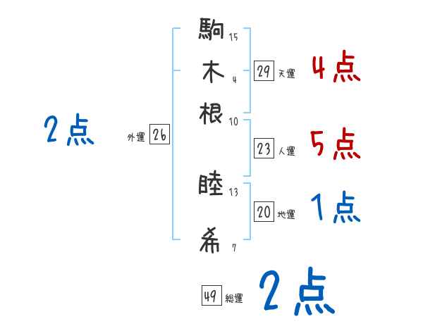 外運![]() | 駒木根睦希さんの外運は26画の2つ星!波瀾万丈かも。信頼できる人を大事にしましょう。 生活面を象徴する運勢です。外部から受ける影響力を表し、結婚運、家庭運や職場、環境への順応性を表します。 |