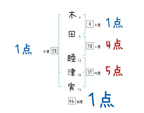 総運![]() | 木田睦津実さんの総運は46画の1つ星!迷走することが多く苦労するかも。目先のことにとらわれないように。 あなたの人生を表す1番重要な運勢です。生涯を通じて影響する総合運となり、主に50歳以降の晩年期に影響を及ぼします。 |
