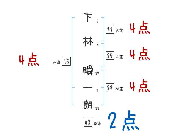 外運![]() | 下林瞬一朗さんの外運は15画の4つ星!人徳があり出世する。順調に物事を進め円満な人生。 生活面を象徴する運勢です。外部から受ける影響力を表し、結婚運、家庭運や職場、環境への順応性を表します。 |