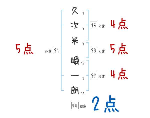 総運![]() | 久次米瞬一朗さんの総運は44画の2つ星!誠実で慎重な性格。物事を考えすぎないように注意しましょう。 あなたの人生を表す1番重要な運勢です。生涯を通じて影響する総合運となり、主に50歳以降の晩年期に影響を及ぼします。 |