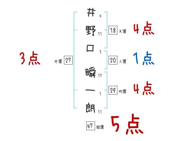 総運![]() | 井野口瞬一朗さんの総運は47画の5つ星!実力が開花し発展する円満な人生。財に恵まれる。 あなたの人生を表す1番重要な運勢です。生涯を通じて影響する総合運となり、主に50歳以降の晩年期に影響を及ぼします。 |