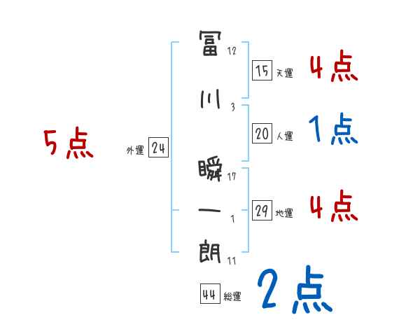 外運![]() | 冨川瞬一朗さんの外運は24画の5つ星!家庭運が良く順調な人生。金運にも恵まれる。 生活面を象徴する運勢です。外部から受ける影響力を表し、結婚運、家庭運や職場、環境への順応性を表します。 |