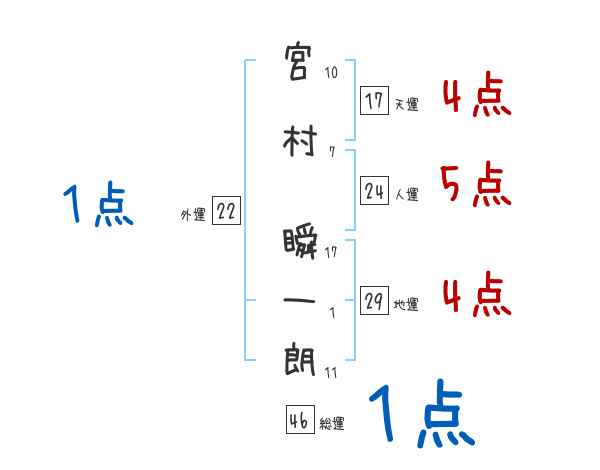 外運![]() | 宮村瞬一朗さんの外運は22画の1つ星!努力することが苦手ないっぽう手先が器用。芸術性にも優れる。 生活面を象徴する運勢です。外部から受ける影響力を表し、結婚運、家庭運や職場、環境への順応性を表します。 |