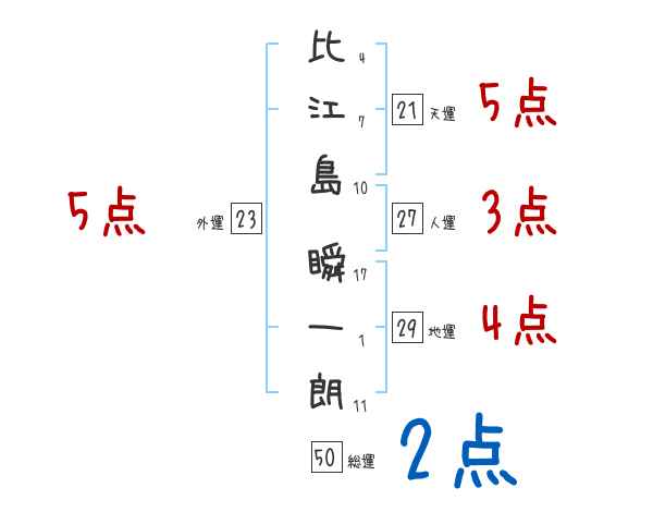 外運![]() | 比江島瞬一朗さんの外運は23画の5つ星!想像力に優れ活力がある。一代で成功し名誉を手に入れる。 生活面を象徴する運勢です。外部から受ける影響力を表し、結婚運、家庭運や職場、環境への順応性を表します。 |