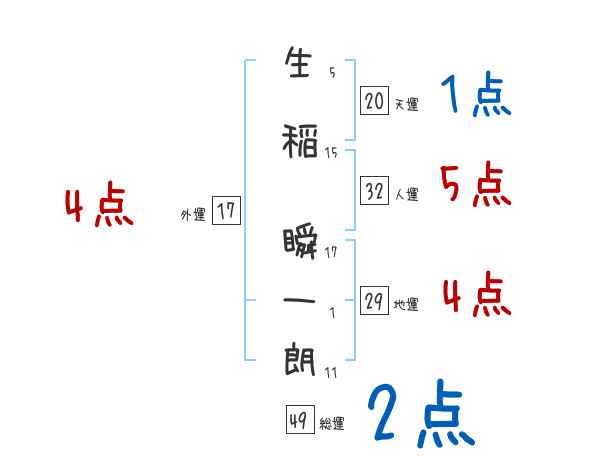 人運![]() | 生稲瞬一朗さんの人運は32画の5つ星!柔軟性があり成功する。チャンスが多く金運が良い。 性格や才能などを表す2番目に重要な運勢です。人間関係や協調性、社会的な成功に影響します。主に20歳から50歳ぐらいまでの中年期の運勢を表します。 |