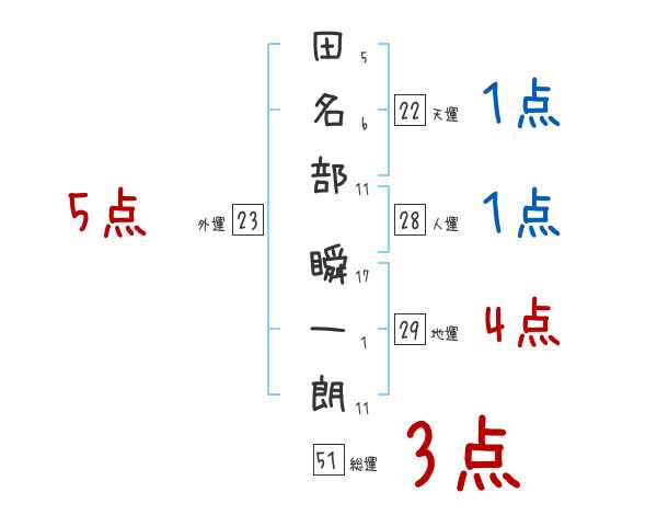 総運![]() | 田名部瞬一朗さんの総運は51画の3つ星!変化が激しく、危険に注意。堅実な性格。 あなたの人生を表す1番重要な運勢です。生涯を通じて影響する総合運となり、主に50歳以降の晩年期に影響を及ぼします。 |