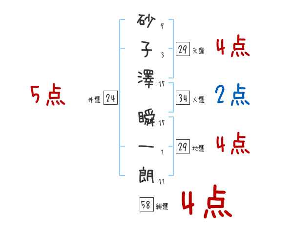 天運![]() | 砂子澤瞬一朗さんの天運は29画の4つ星!完全主義で才能がある。厳格な心の持ち主。 家系が持つ宿命的な運勢を表します。祖先から受け継いだ苗字ですので自分の力が及びません。家柄を象徴します。 |