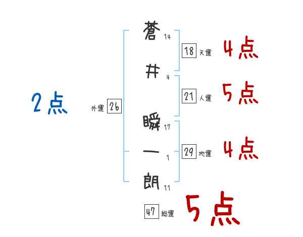 人運![]() | 蒼井瞬一朗さんの人運は21画の5つ星!統率力がある。独立し成功する。名誉を手に入れる。 性格や才能などを表す2番目に重要な運勢です。人間関係や協調性、社会的な成功に影響します。主に20歳から50歳ぐらいまでの中年期の運勢を表します。 |