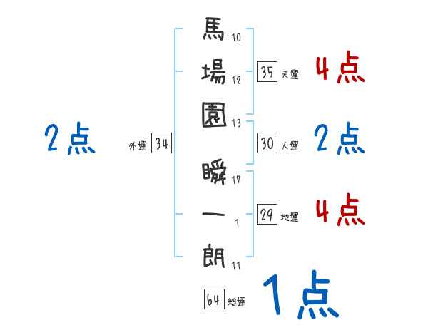 天運![]() | 馬場園瞬一朗さんの天運は35画の4つ星!温厚な性格で感受性が高い。穏和な性格で人望が厚い。 家系が持つ宿命的な運勢を表します。祖先から受け継いだ苗字ですので自分の力が及びません。家柄を象徴します。 |