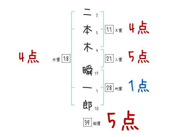 総運![]() | 二本木瞬一郎さんの総運は39画の5つ星!社交性に優れ人望が厚い。人の上に立ち成功する。 あなたの人生を表す1番重要な運勢です。生涯を通じて影響する総合運となり、主に50歳以降の晩年期に影響を及ぼします。 |