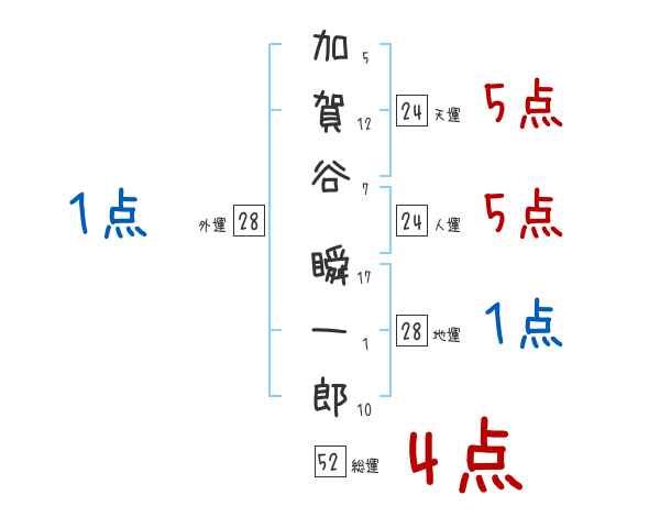 地運![]() | 加賀谷瞬一郎さんの地運は28画の1つ星!家庭環境に注意。スポーツで活躍できる能力があるかも。 個性を表す基礎的な運勢です。性格形成や対人関係、行動力など家庭環境に影響されます。主に誕生してから20歳くらいまでの若年期の運勢を表します。 |