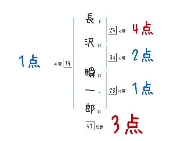 外運![]() | 長沢瞬一郎さんの外運は19画の1つ星!優れた才能を持ちますが、協調性が足りないことも。周りの人と協力する事を意識しましょう。 生活面を象徴する運勢です。外部から受ける影響力を表し、結婚運、家庭運や職場、環境への順応性を表します。 |