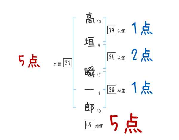 外運![]() | 高垣瞬一郎さんの外運は21画の5つ星!統率力がある。独立し成功する。名誉を手に入れる。 生活面を象徴する運勢です。外部から受ける影響力を表し、結婚運、家庭運や職場、環境への順応性を表します。 |