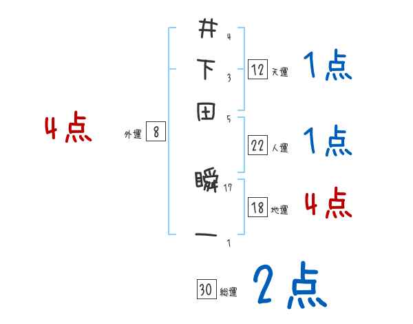 天運![]() | 井下田瞬一さんの天運は12画の1つ星!簡単な失敗で諦めてしまいやすいかも。着実に行動すると良いでしょう。 家系が持つ宿命的な運勢を表します。祖先から受け継いだ苗字ですので自分の力が及びません。家柄を象徴します。 |