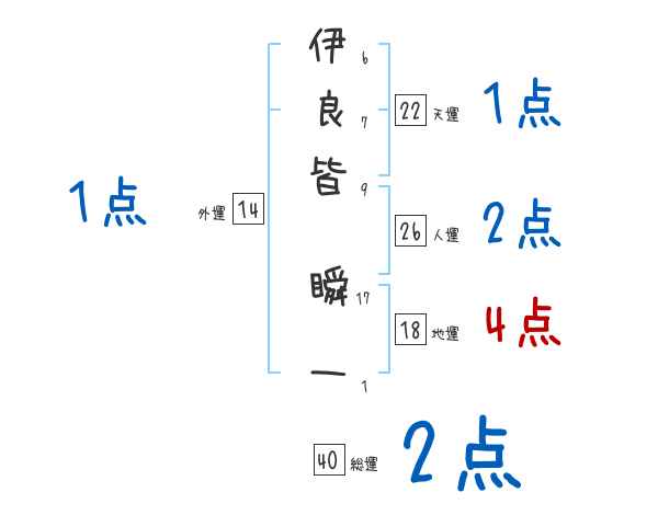 総運![]() | 伊良皆瞬一さんの総運は40画の2つ星!自信過剰で物事に固執するためトラブルに注意。 あなたの人生を表す1番重要な運勢です。生涯を通じて影響する総合運となり、主に50歳以降の晩年期に影響を及ぼします。 |