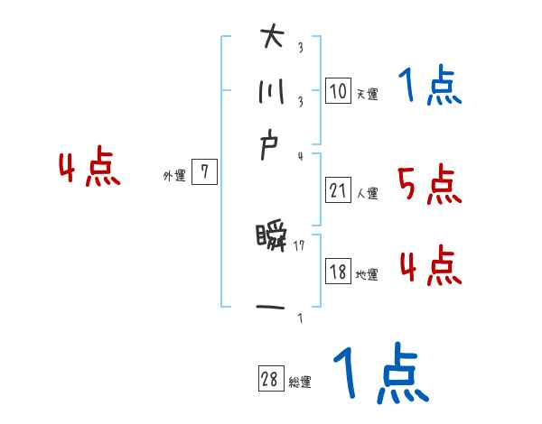総運![]() | 大川戸瞬一さんの総運は28画の1つ星!家庭環境に注意。スポーツで活躍できる能力があるかも。 あなたの人生を表す1番重要な運勢です。生涯を通じて影響する総合運となり、主に50歳以降の晩年期に影響を及ぼします。 |