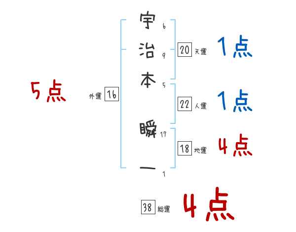 外運![]() | 宇治本瞬一さんの外運は16画の5つ星!人望が厚く大きく発展する。逆転成功が見える。 生活面を象徴する運勢です。外部から受ける影響力を表し、結婚運、家庭運や職場、環境への順応性を表します。 |