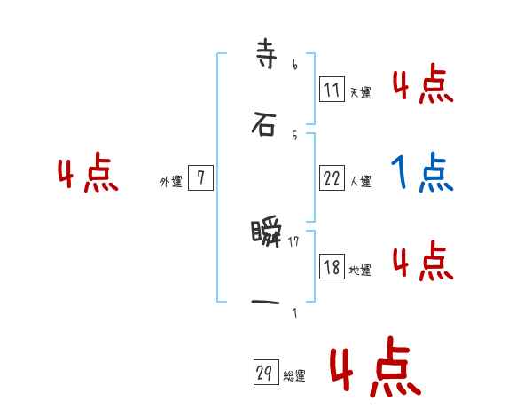 外運![]() | 寺石瞬一さんの外運は7画の4つ星!強い意志や信念を持ち独立心が強い。自立する。 生活面を象徴する運勢です。外部から受ける影響力を表し、結婚運、家庭運や職場、環境への順応性を表します。 |