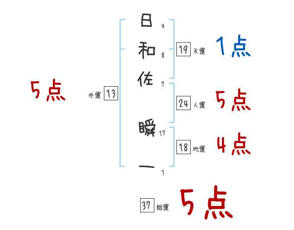天運![]() | 日和佐瞬一さんの天運は19画の1つ星!優れた才能を持ちますが、協調性が足りないことも。周りの人と協力する事を意識しましょう。 家系が持つ宿命的な運勢を表します。祖先から受け継いだ苗字ですので自分の力が及びません。家柄を象徴します。 |
