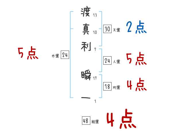 天運![]() | 渡真利瞬一さんの天運は30画の2つ星!浮き沈みの激しさに注意しましょう。 家系が持つ宿命的な運勢を表します。祖先から受け継いだ苗字ですので自分の力が及びません。家柄を象徴します。 |