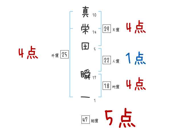 総運![]() | 真栄田瞬一さんの総運は47画の5つ星!実力が開花し発展する円満な人生。財に恵まれる。 あなたの人生を表す1番重要な運勢です。生涯を通じて影響する総合運となり、主に50歳以降の晩年期に影響を及ぼします。 |