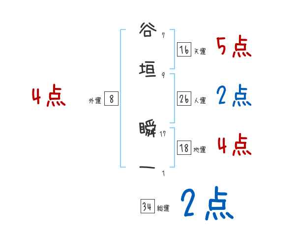 総運![]() | 谷垣瞬一さんの総運は34画の2つ星!独創性に優れるが、自尊心が強く災難に注意しましょう。 あなたの人生を表す1番重要な運勢です。生涯を通じて影響する総合運となり、主に50歳以降の晩年期に影響を及ぼします。 |